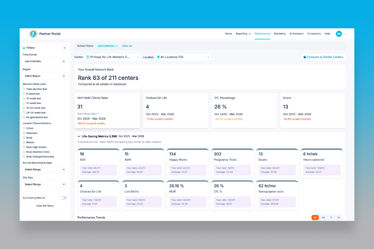 The portal enabled pregnancy centers to report on key outcomes — including client volumes, decision data, and operational details — with reporting views that accommodated multi-location center networks, allowing individual locations to report separately within a shared organizational structure.