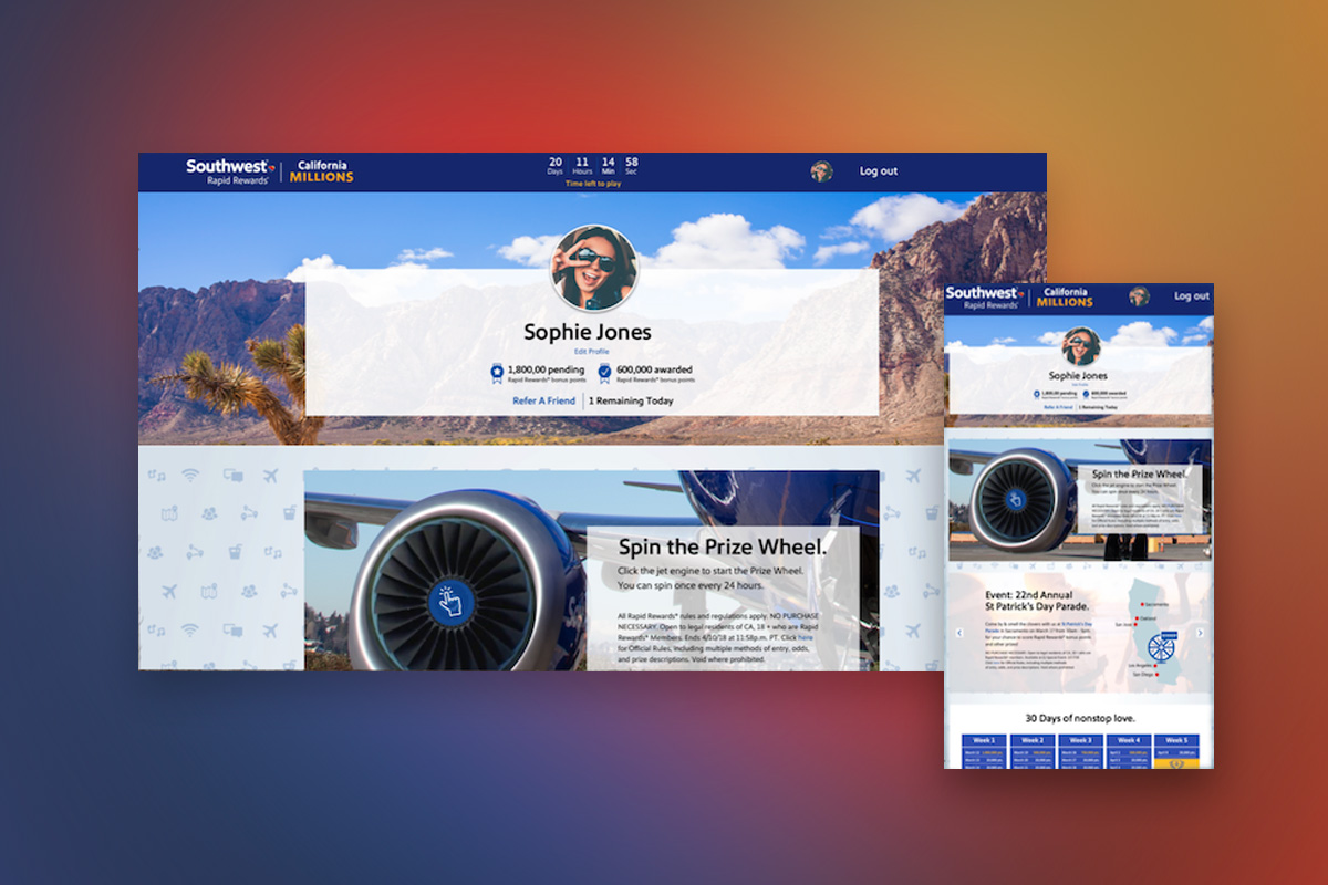 Southwest Airlines had plans for an unprecedented 1,000,000 Rapid Reward Points© giveaway (the largest in airline history). Southwest asked New Normal to create an online giveaway to mirror their contest events in cities across California.