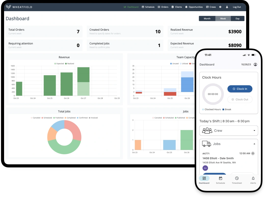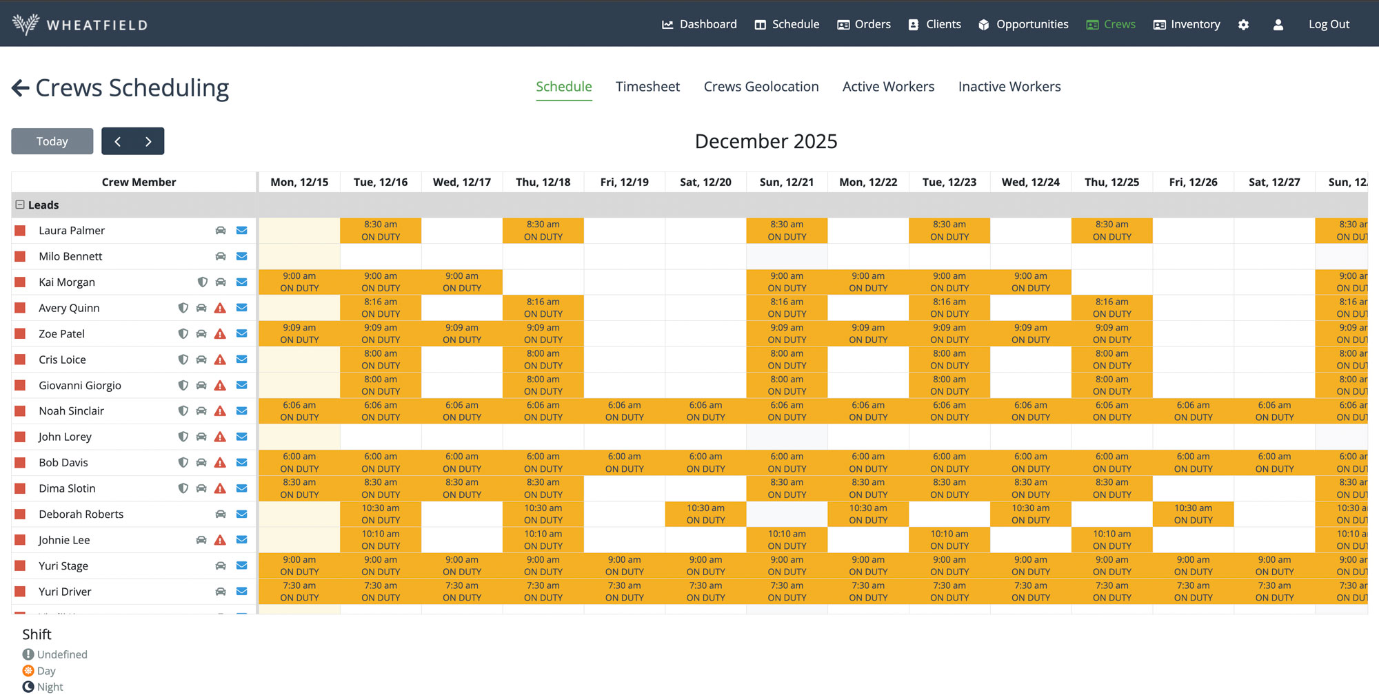 Wheatfield covers everything you need: geo-fenced time tracking, crew and inventory management, reporting, scheduling and more. No more spreadsheets.